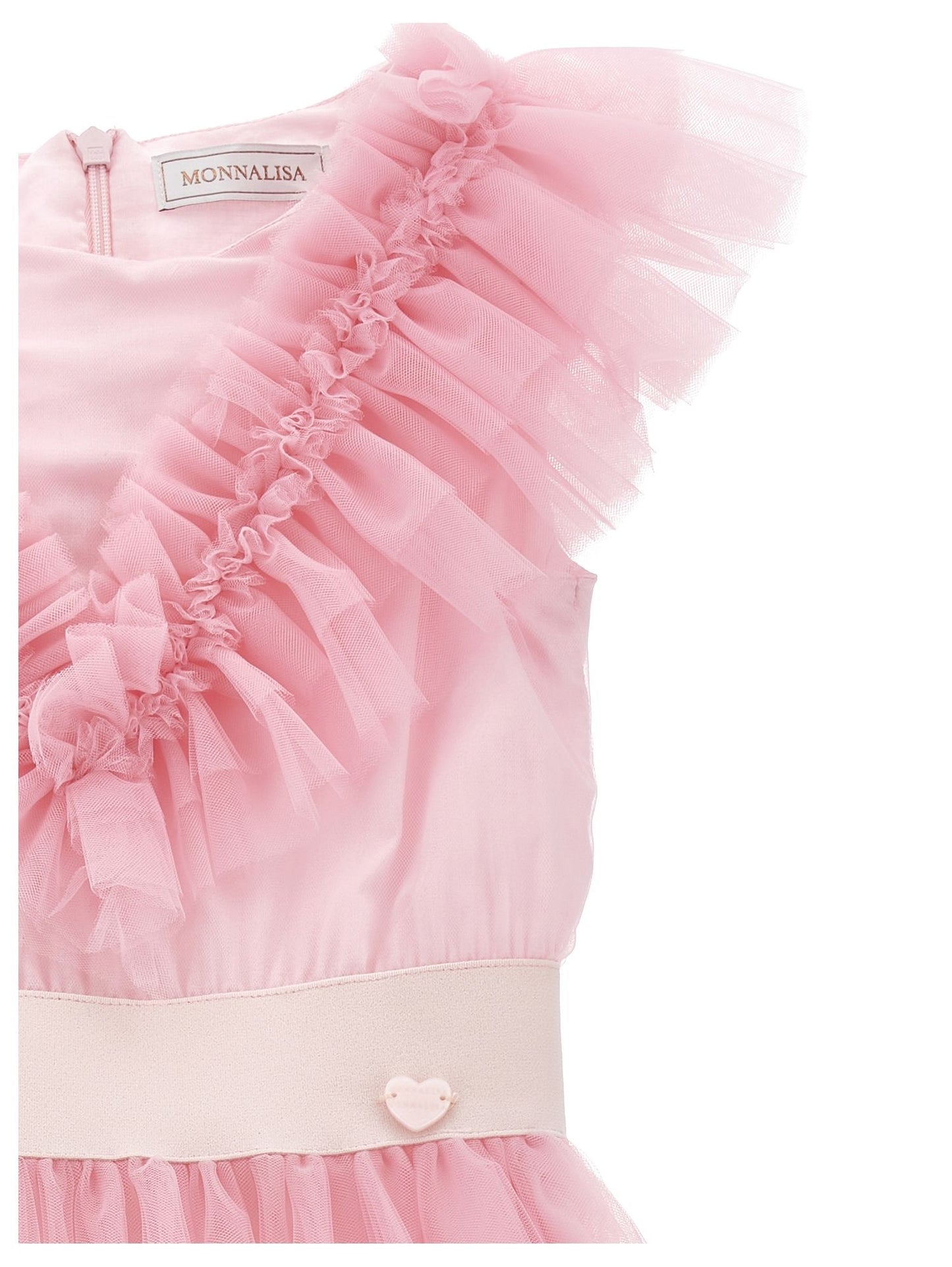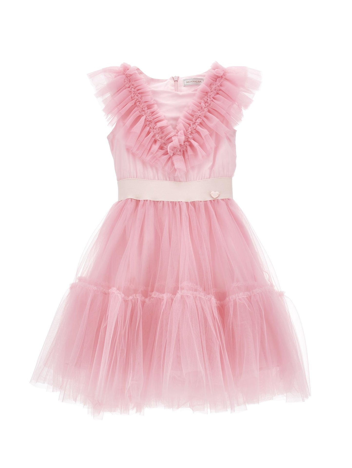 • square neckline framed by V-shaped ruffles